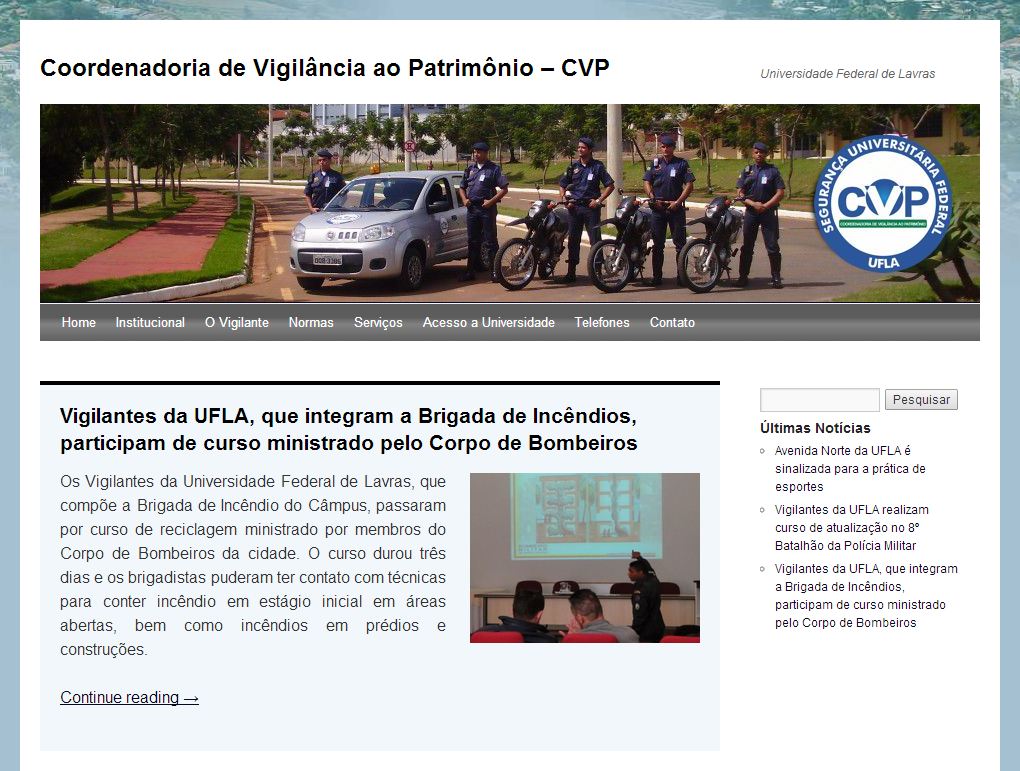 A Coordenadoria de Vigilância e Patrimônio (CVP), com o apoio da Assessoria de Comunicação Social (Ascom), lançou um novo site: www.vigilancia.ufla.br. O espaço virtual tem como objetivo informar a comunidade acadêmica sobre a importância do trabalho da Vigilância, e apresenta ainda informações sobre circulação e permanência no câmpus, bem como condutas a serem observadas.