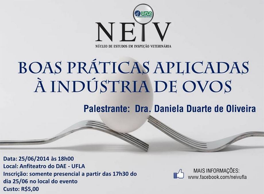 O Núcleo de Estudos em Inspeção Veterinária (Neiv) promoverá a palestra “Boas práticas aplicadas à indústria de ovos”, a ser ministrada pela médica veterinária Daniela Duarte de Oliveira, no dia 25 de junho. O evento será às 18h, no Anfiteatro do Departamento de Administração e Economia (DAE).