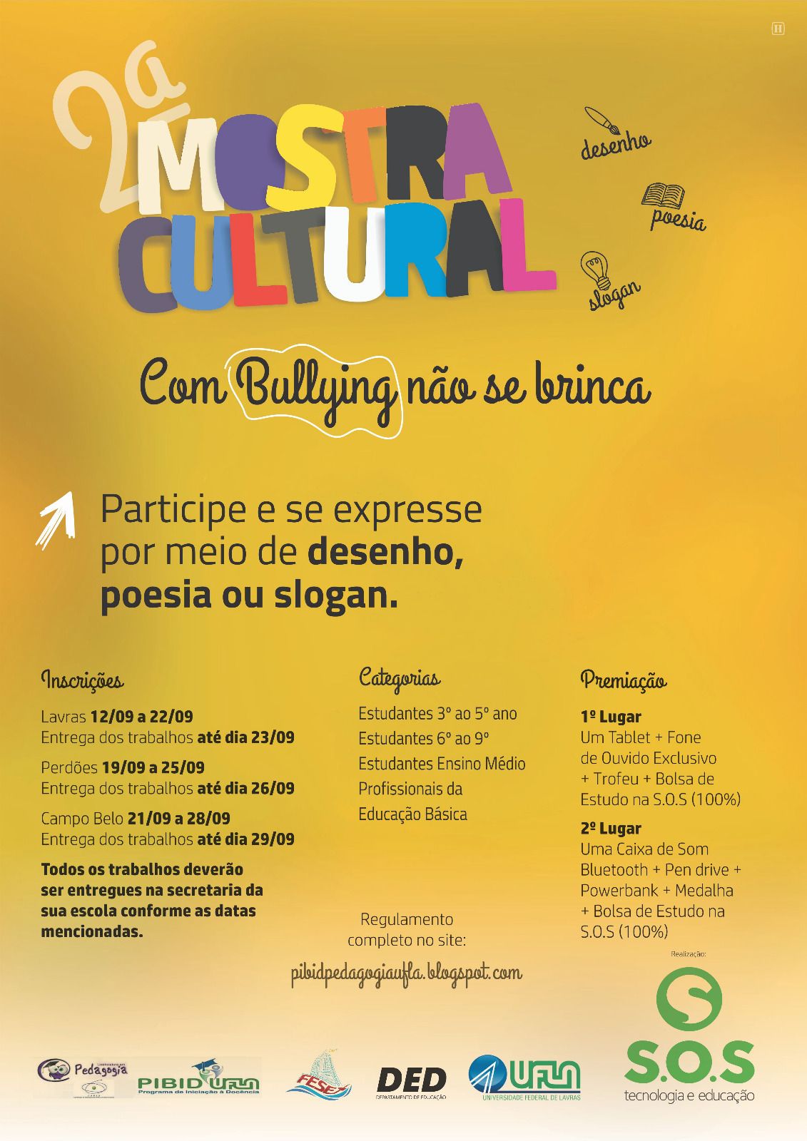 A II Mostra Cultural é realizada pelo Grupo de Pesquisa Relações entre a Filosofia e a Educação para a Sexualidade na Contemporaneidade (Fesex) da Universidade Federal de Lavras (UFLA) e o Programa Institucional de Bolsas de Iniciação à Docência (Pibid Pedagogia UFLA) em parceria com S.O.S Educação Profissional. O objetivo é de contribuir com ações para “assegurar medidas de conscientização, prevenção, diagnose e combate à violência e intimidação sistemática (bullying)”, conforme redação da Lei nº 13.185/16 que institui o Programa de Combate à Intimidação Sistemática.