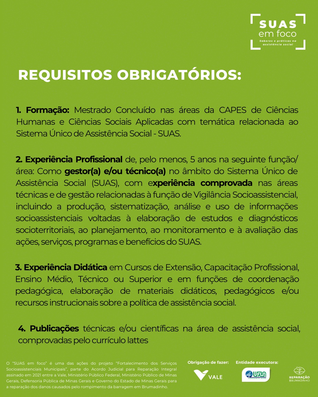 A seleção, regida pelo Edital nº 005/2026, tem como objetivo a contratação de profissional para atuação na elaboração de material didático do Curso 12 – “Gestão do SUAS: Planejamento e Vigilância Socioassistencial”, no âmbito do Projeto “Fortalecimento dos serviços socioassistenciais municipais – Brumadinho e Bacia do Paraopeba”.